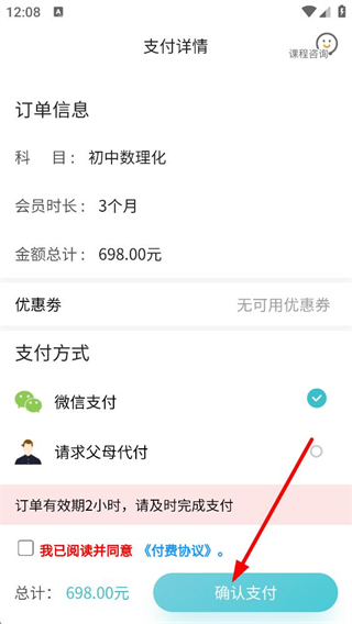 3、支付詳情頁,確認科目、會員時長等信息,選擇微信支付或請求父母代付方式,勾選付費協議后點擊確認支付,完成會員開通流程。