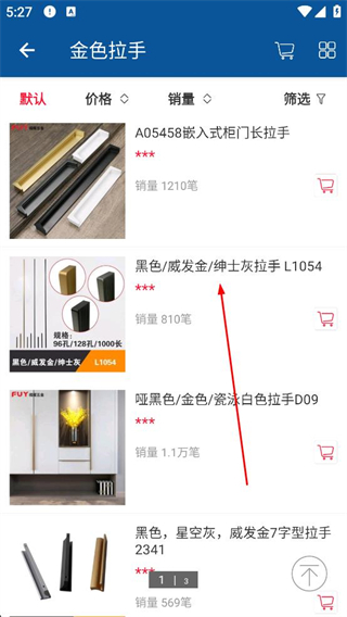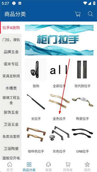 1、打開福耀建材軟件,進入商品分類頁面,選擇柜門拉手分類下的金色拉手選項,瀏覽展示的拉手商品列表,挑選目標商品進入詳情頁。