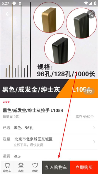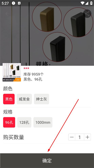 3、在規格選擇頁面挑選想要的拉手顏色,選擇對應的規格如96孔,確認購買數量,核對所選信息是否符合需求。