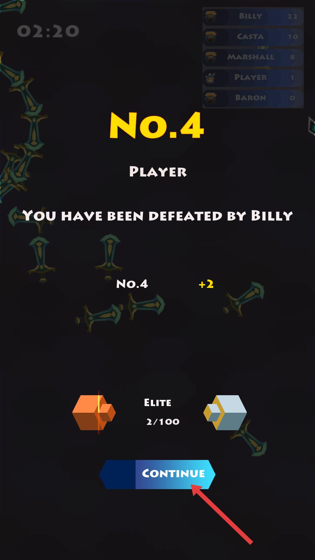 4、若被敵人擊敗,界面會顯示失敗信息,此時點擊CONTINUE按鈕可繼續游戲,重新挑戰,提升戰斗技巧爭取勝利。