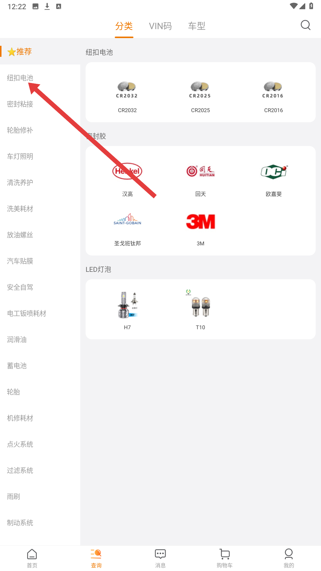 3、查詢板塊的分類頁面,可看到紐扣電池、密封粘接等多種汽車用品分類,點擊對應分類可查看具體商品。