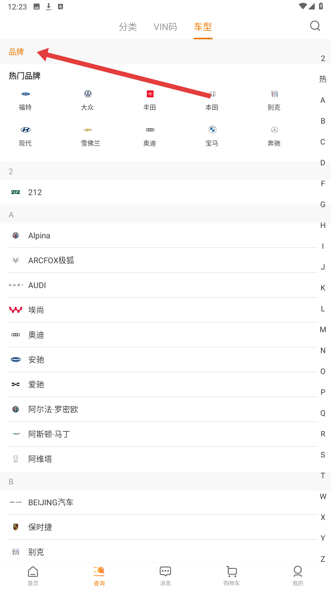 4、車型查詢頁面,可按品牌查找汽車,有熱門品牌及按字母排序的眾多汽車品牌可供選擇,方便查找對應車型的養護用品。