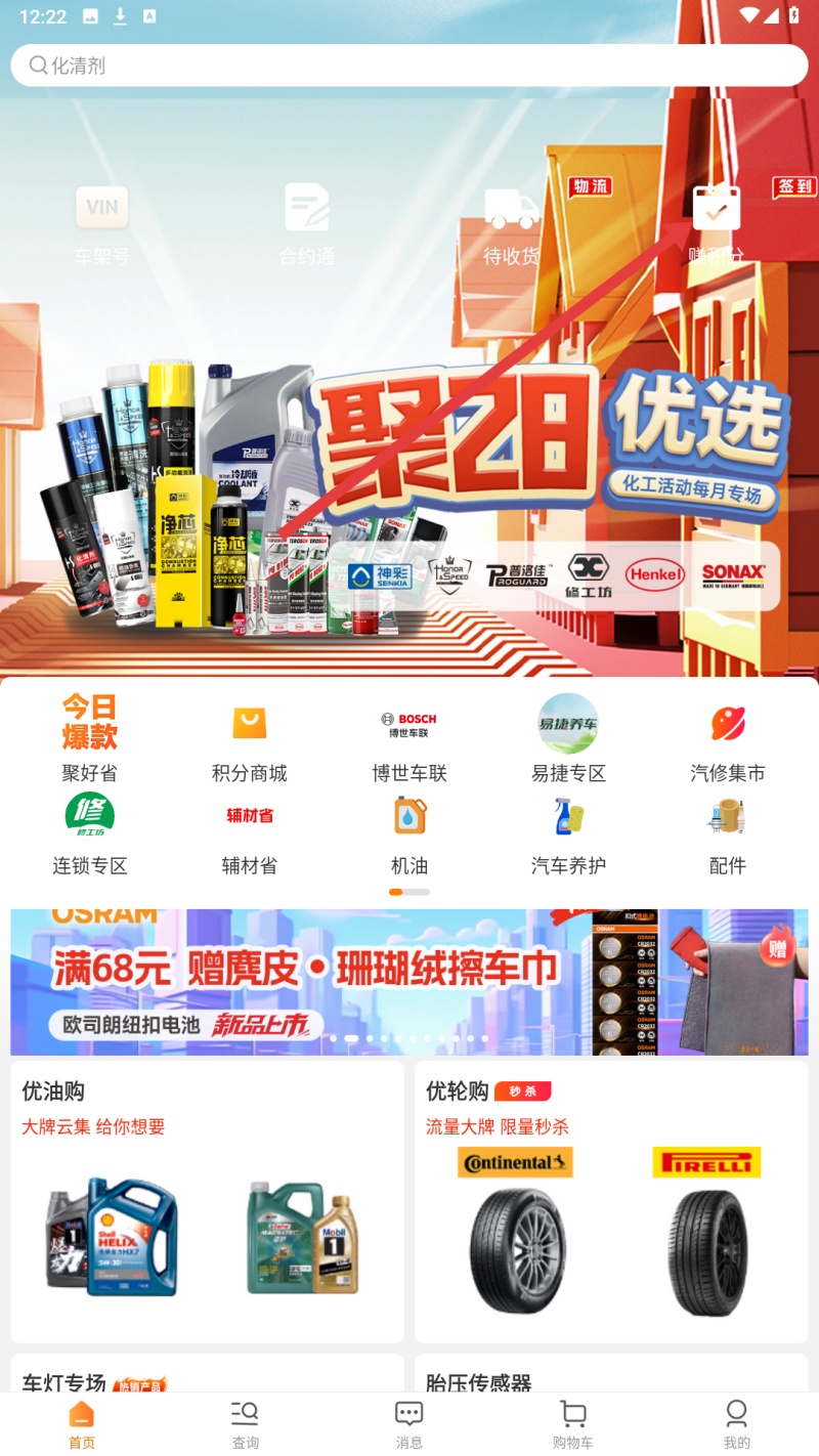 1、進入平臺首頁,可看到搜索欄、車架號、合約通等功能入口,還有各類汽車養護商品及優惠活動,點擊賺積分可參與積分活動。