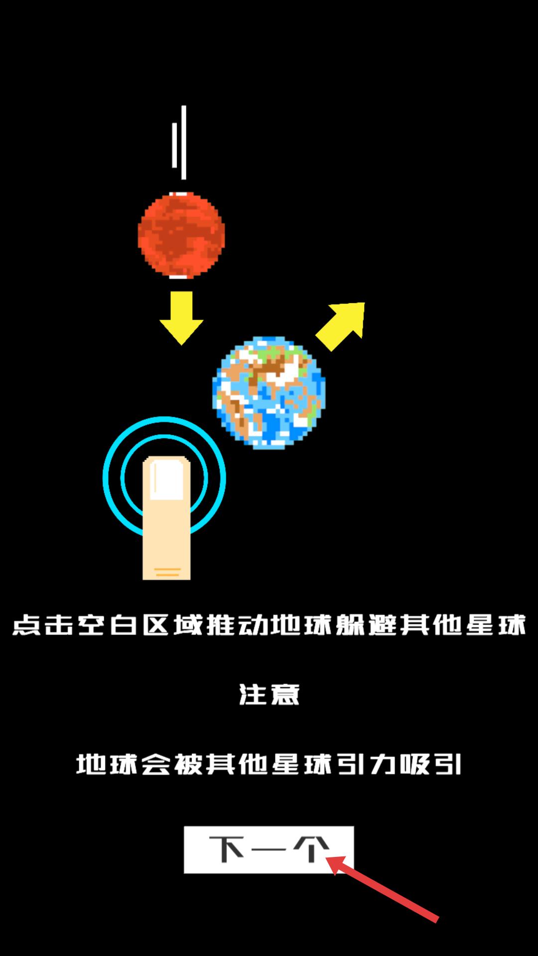 2、游戲提示點擊空白區域推動地球躲避其他星球,且地球會受其他星球引力吸引,按提示操作靈活躲避星球,避免碰撞。