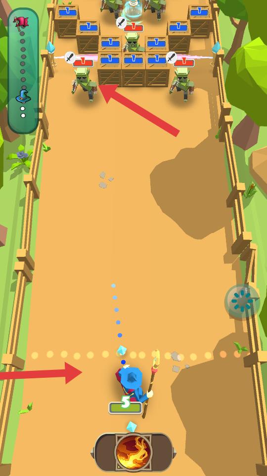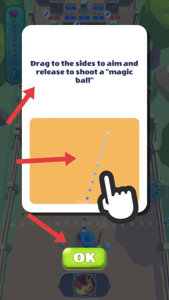 2、游戲會彈出操作提示,按照游戲的指引,滑動瞄準后釋放,發射魔法球。