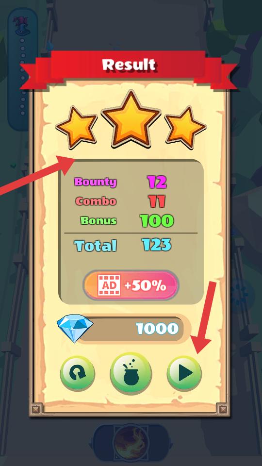 4、關卡結束后,會顯示Result界面,展示獲得的星星,分數等,若想繼續,可點擊相應按鈕開啟下一關。