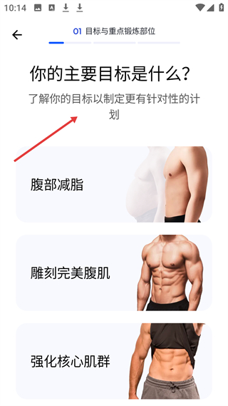 1、目標選擇板塊可選擇腹部減脂、雕刻腹肌等目標,制定針對性計劃,幫助用戶明確健身方向,為后續鍛煉規劃科學路徑。