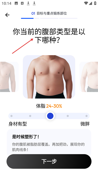 2、腹部類型判斷板塊通過體脂區間判斷腹部類型,讓用戶了解自身腹部狀況,為塑形提供依據,實現精準鍛煉。