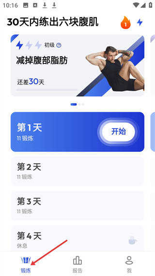 4、鍛煉板塊展示30天練出腹肌的計劃,按天安排鍛煉和休息,助力用戶科學練腹,逐步達成腹肌目標節奏合理。
