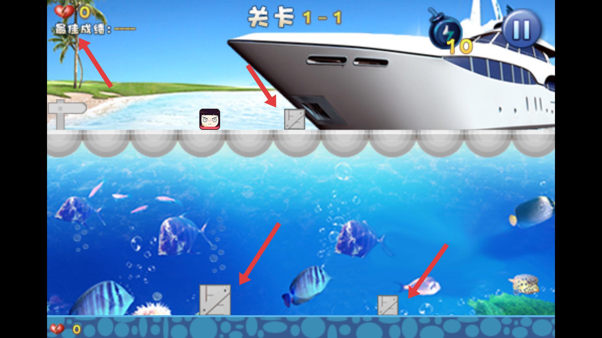 3、在關卡1操控角色在海面和海底之間移動,避開障礙物,同時收集場景中的物品,提升游戲成績。
