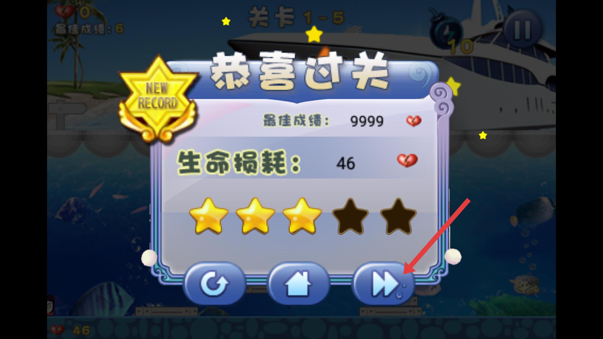 4、成功通關后界面顯示恭喜過關,查看最佳成績和生命損耗等信息,然后點擊箭頭按鈕進入下一個關卡繼續挑戰。