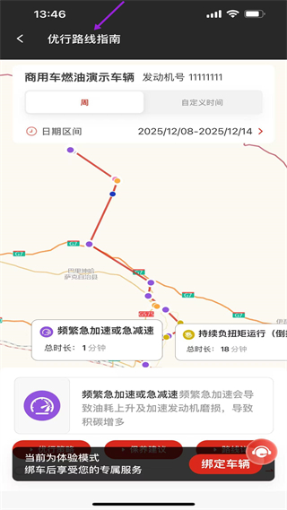 2、進入優行路線指南頁面,查看車輛周期內行駛路線與駕駛行為分析,了解不良駕駛影響,獲取對應的優化建議。