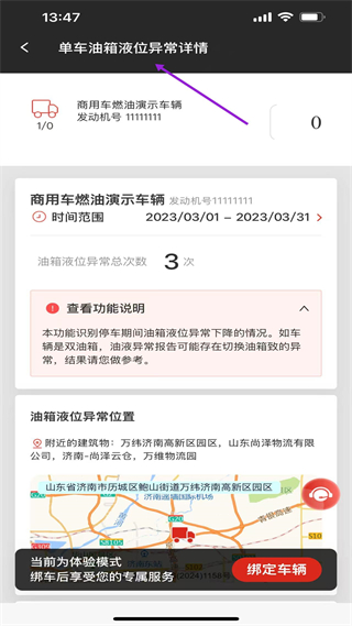 4、進入油箱液位異常詳情頁面,查看異常次數、位置等信息,了解功能說明,輔助排查油箱液位異常情況。