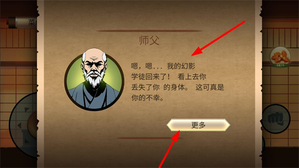1、查看師父的對話,了解當前劇情背景,點擊更多按鈕繼續推進劇情,開啟暗影武者的修行流程。