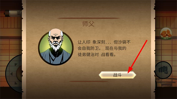 4、完成沙袋練習后,點擊戰斗按鈕,與師父的徒弟健治對戰,檢驗修行成果,繼續提升暗影武者的戰斗能力。