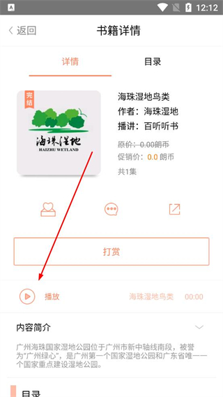 4、在書籍詳情頁找到播放按鈕,點擊該按鈕開始收聽海珠濕地鳥類的音頻內容,體驗聽書功能。