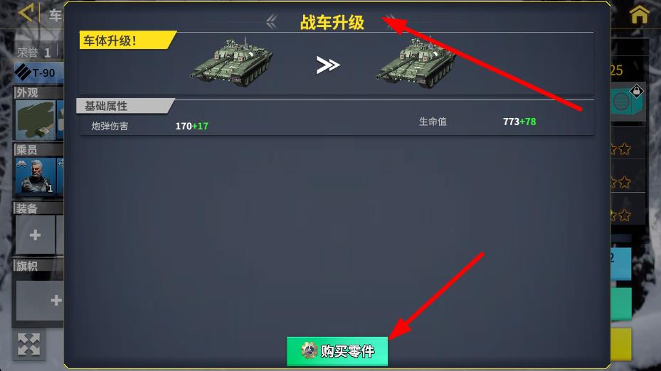 4、在戰車升級界面購買零件,升級坦克車體,提升炮彈傷害和生命值等屬性,優化坦克戰斗能力。