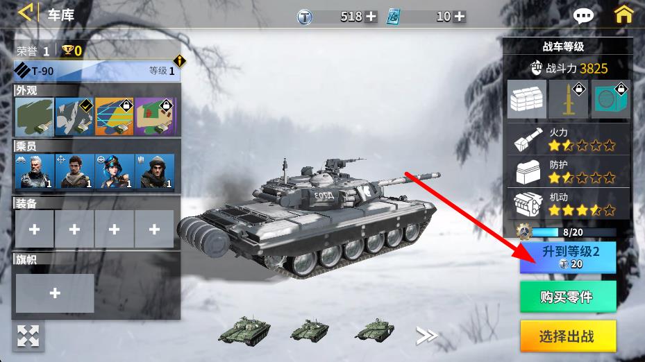 3、在車庫界面消耗資源將T90坦克升到等級2,提升坦克的火力、防護等屬性,增強戰場表現。