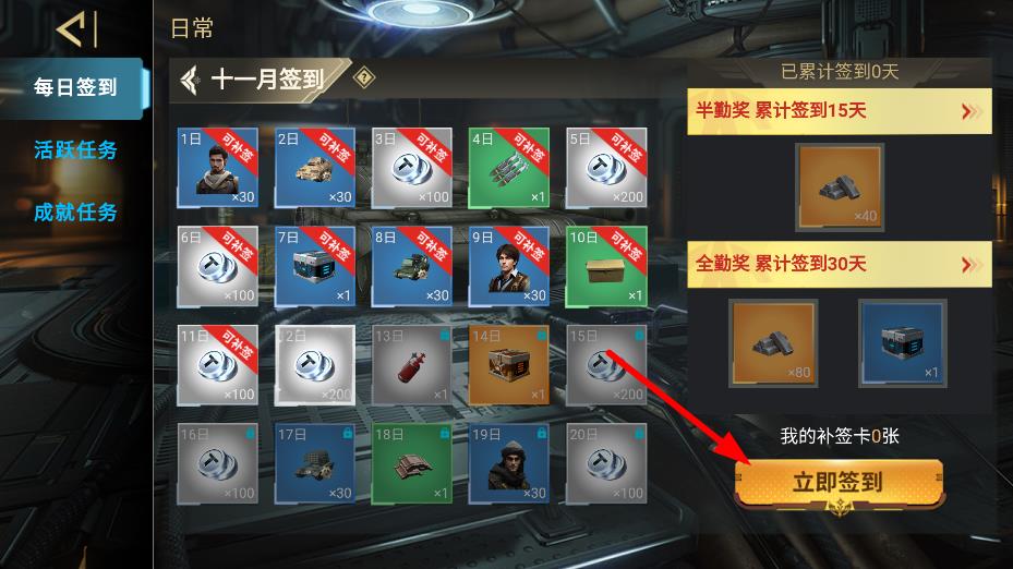 1、在每日簽到界面點擊立即簽到,領取簽到獎勵,積累資源,用于坦克升級和研發,提升游戲進程。