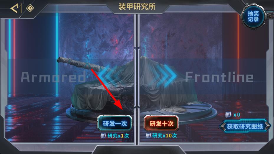 2、進入裝甲研究所,點擊研發一次,參與坦克研發,有機會獲取新坦克或坦克升級材料,增強戰力。