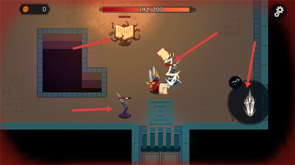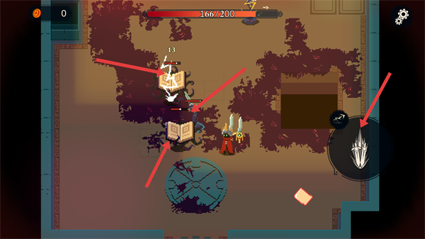 2、在場景里會遇到敵人,同時存在發光書本等元素,點擊右側技能圖標,可釋放技能攻擊敵人,過程中要留意自身生命值。
