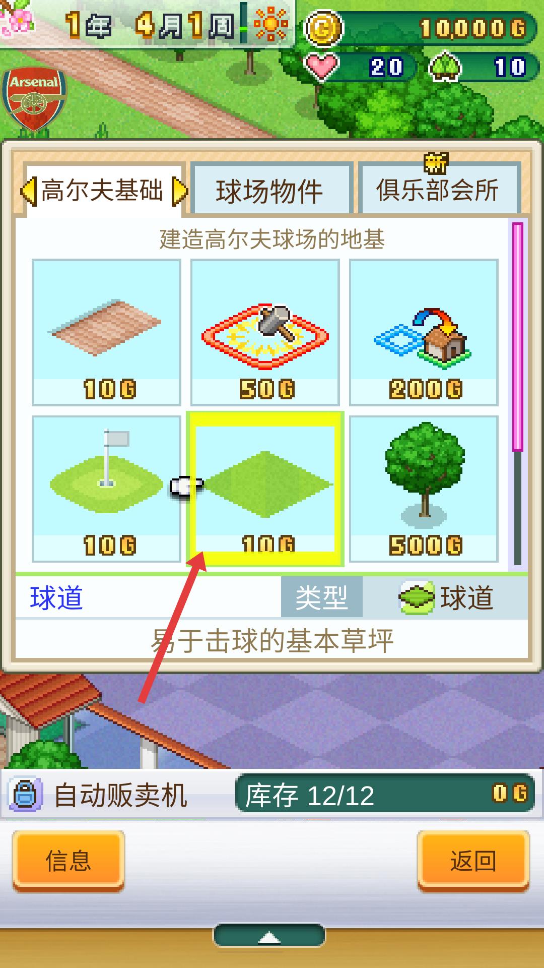 3、在建設界面,有高爾夫基礎等分類,選擇球道相關的基本草坪選項,花費10G,可建造用于擊球的球道。