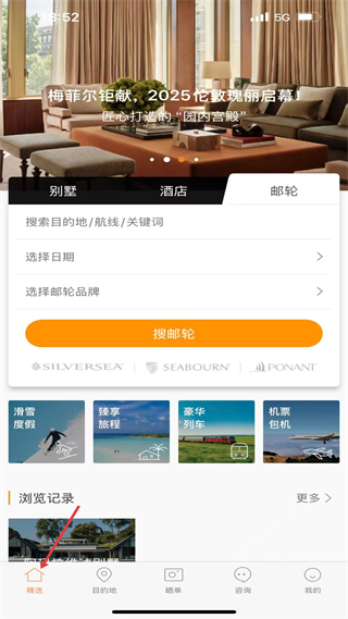 1、在精選頁面,可見郵輪等服務搜索入口,含滑雪度假等分類板塊,可通過搜索框輸入關鍵詞查找旅行資源。