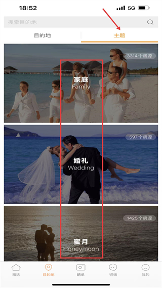 2、切換至目的地主題頁,可按家庭、婚禮等主題篩選房源,每個主題標注對應房源數量,便于精準匹配需求。