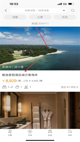 3、選擇家庭主題后,展示對應房源列表,含唯逸度假酒店等選項,標注價格、房型信息,支持查看詳情。