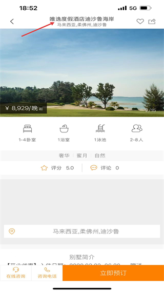 4、進入酒店詳情頁,可查看位置、房型配置、評分等信息,底部設立即預訂按鈕,支持直接預訂。