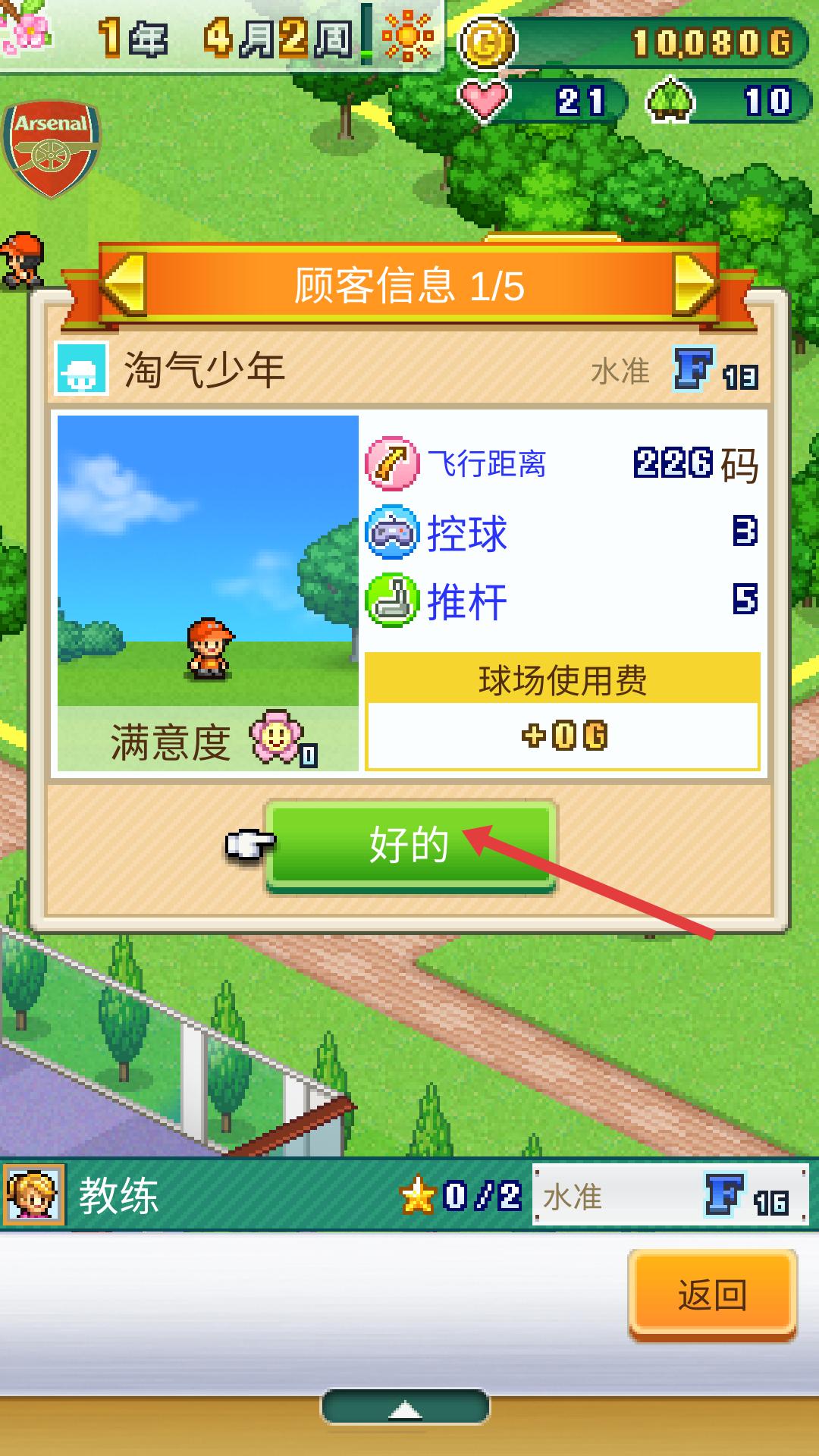 2、進入游戲后,會出現顧客信息界面,查看飛行距離、控球、推桿等信息,點擊好的,可確認顧客信息,推進游戲。