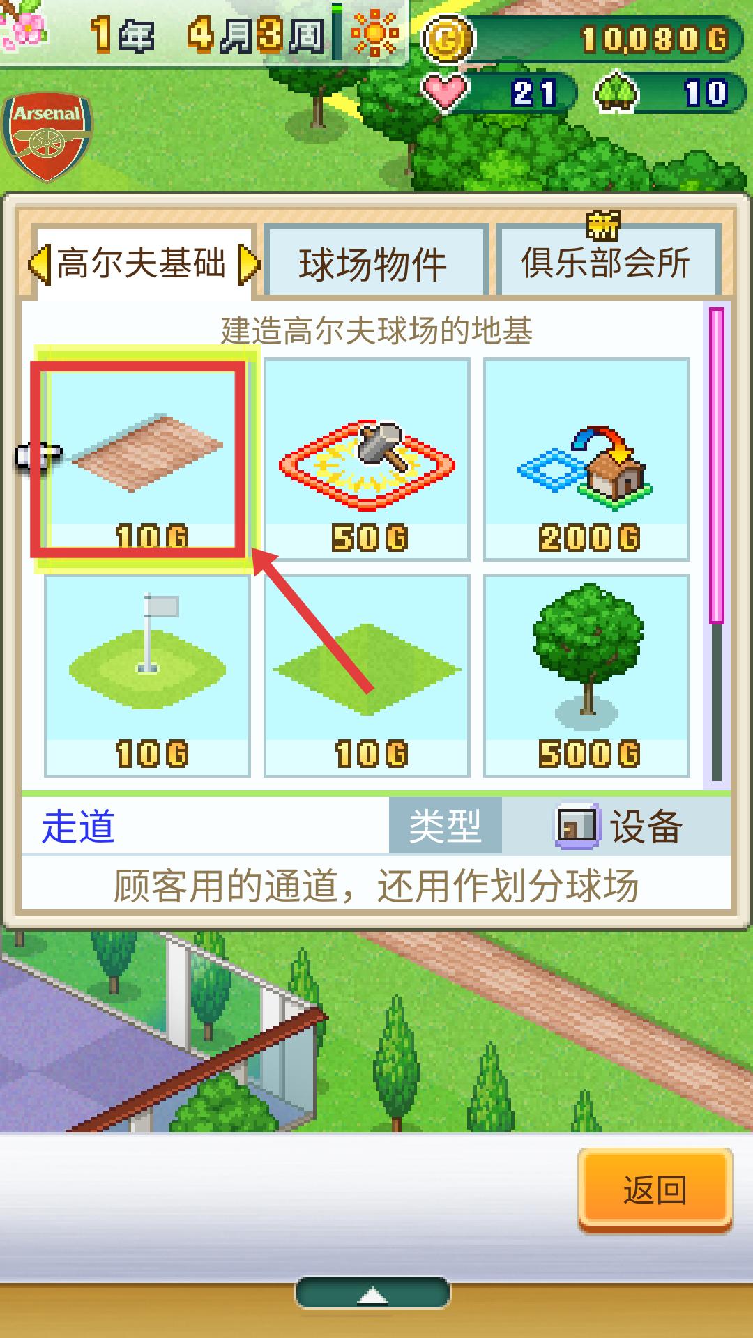 3、在建設相關界面,選擇高爾夫基礎分類下的走道選項,花費10G,可建造顧客用的通道,用于劃分球場,完善場地建設。