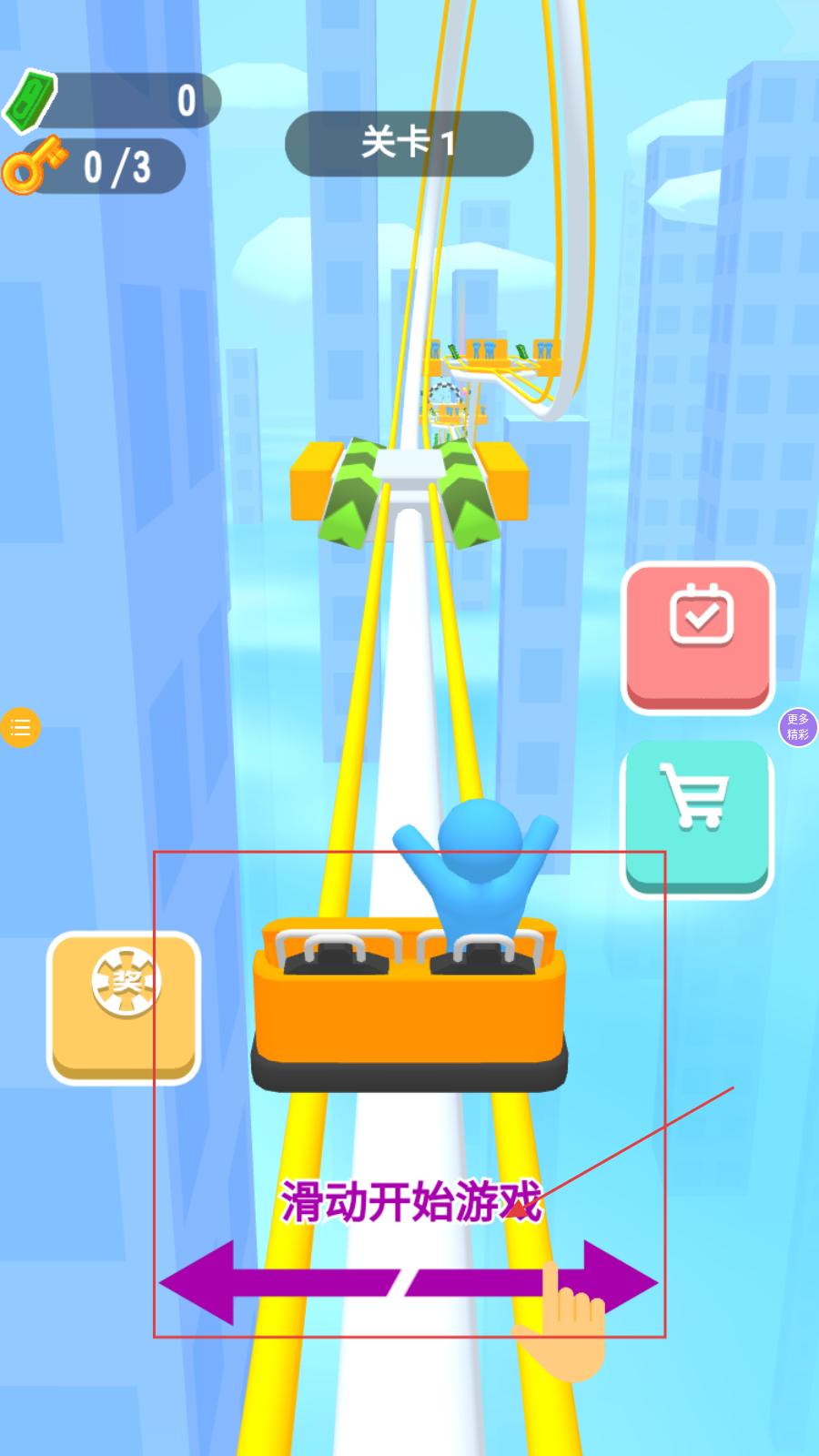 1、進入后,可滑動屏幕【開始游戲】,要操控過山車左右移動,避開軌道障礙,收集綠色鈔票。