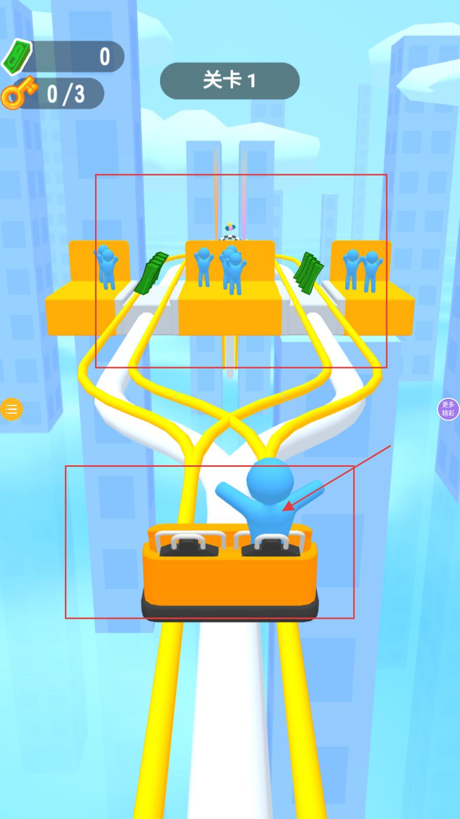 2、當玩家遇到分岔軌道,選擇人數多的路徑,碰撞藍色小人,增加車上乘客數量,提升收益。
