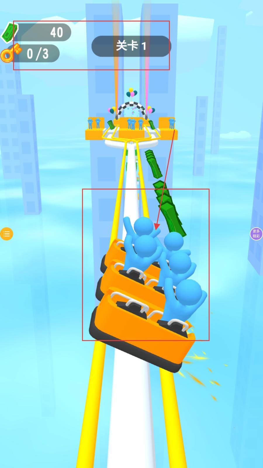 3、玩家需要保持操作穩定,讓過山車順利通過彎道、坡道,抵達終點,獲取勝利獎勵,積累貨幣。