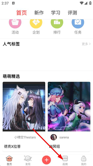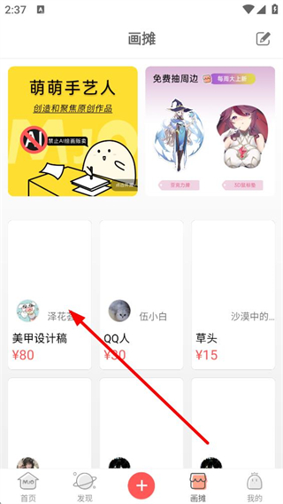 1、進入應用首頁可瀏覽人氣標簽和萌萌精選板塊,查看各類原創作品,通過底部導航欄切換至畫攤板塊,進入作品交易界面。