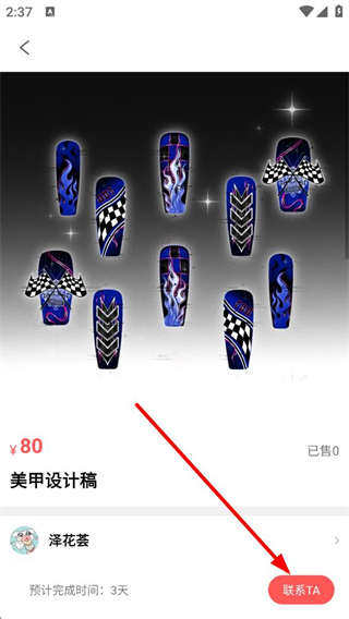 3、進入作品詳情頁能看到完整的作品展示,以及價格已售狀態和預計完成時間,點擊聯系TA按鈕可發起與創作者的溝通。