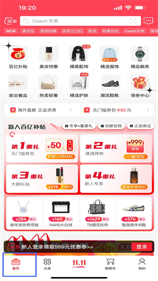1、首頁雙11大促新人享百億補貼,功能入口含百億補貼、美妝特惠等,還有新人專享商品,可選購奢品美妝等。