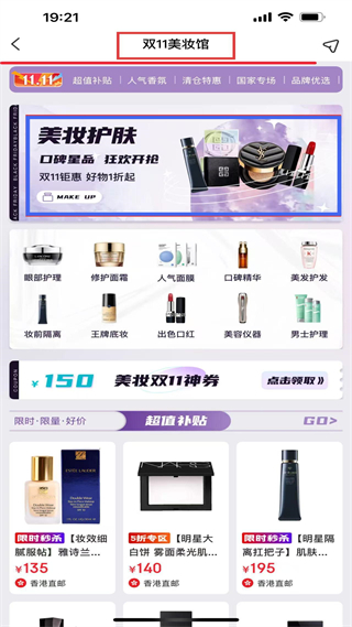 4、雙11美妝館頁,美妝護膚好物1折起,有眼部護理、修護面霜等分類,可領美妝神券,選購雅詩蘭黛、NARS等美妝品。