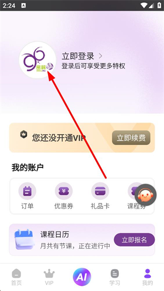 2、進入個人中心頁面,顯示立即登錄入口,還有我的賬戶、課程日歷等模塊,點擊立即登錄,進入登錄相關頁面。