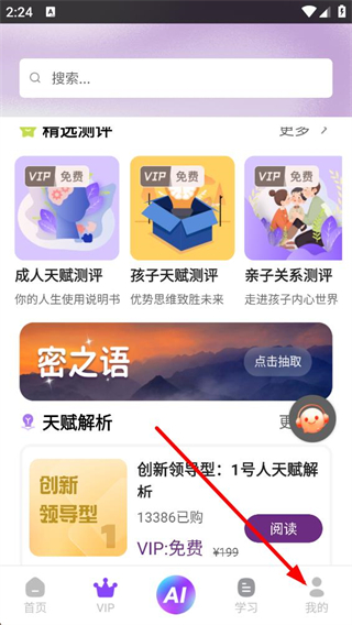1、進入應用首頁,可見天賦測評等測評模塊,還有天賦解析內容,點擊底部我的選項,進入個人中心頁面。