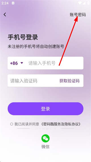 3、進入手機號登錄頁面,可輸入手機號獲取驗證碼登錄,點擊右上角賬號密碼選項,切換到賬號密碼登錄界面。