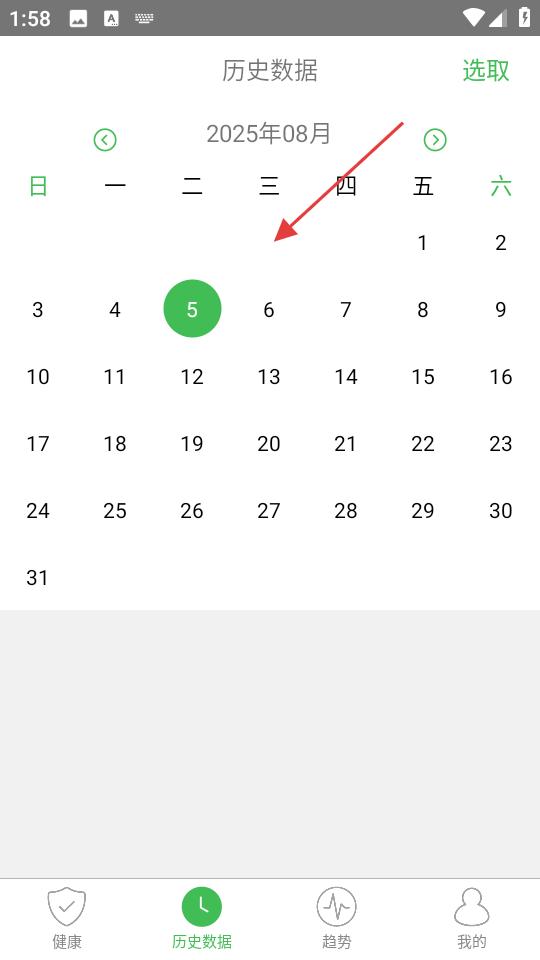 2、歷史數據頁面,展示了2025年8月的日歷,用戶可選取日期查看對應歷史數據,方便了解自身健康數據的變化情況。