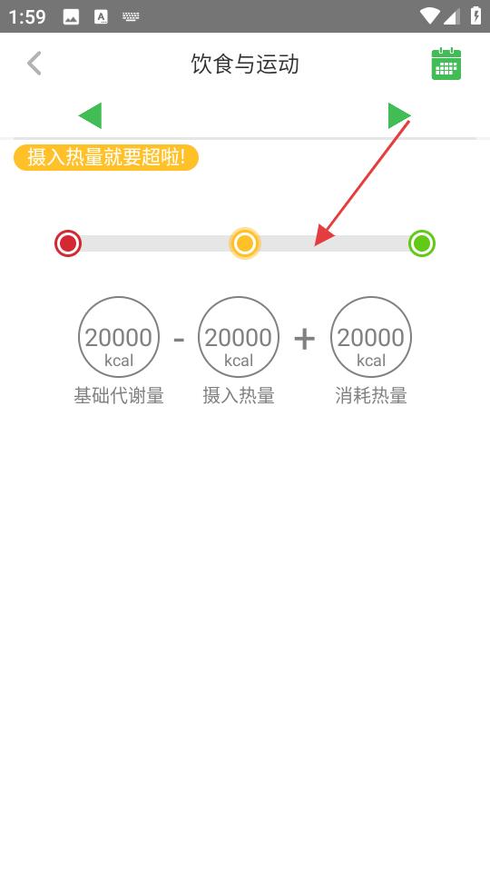 3、飲食與運動頁面,展示了基礎代謝量、攝入熱量和消耗熱量的信息,提示攝入熱量即將超標。