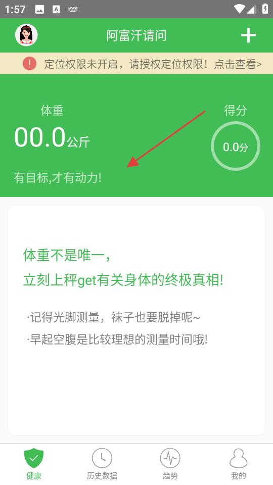 1、健康頁面,顯示用戶體重和得分,提示定位權限未開啟,有相關測量小貼士,用戶可在健康、歷史數據等頁面間切換。