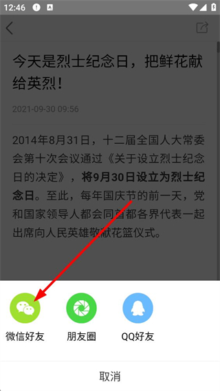 4、烈士紀念日詳情頁操作分享,會彈出微信好友朋友圈等分享選項,可選擇對應渠道將該內容分享給他人。