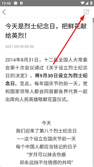 3、點擊烈士紀念日內容進入詳情頁,可了解到2014年通過決定將9月30日設為烈士紀念日,每年國慶前會有敬獻花籃儀式。