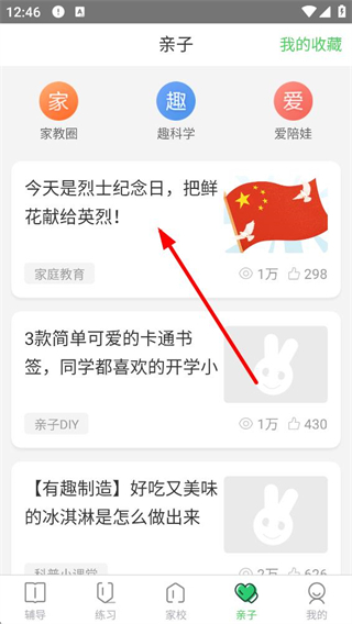 2、進入親子頁面后,能看到家教圈趣科學等分類板塊,還有烈士紀念日相關內容展示,可查看這類主題的資訊信息。