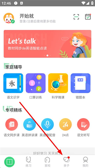 1、進入開始就主界面,可見家庭輔導與專項精練等功能板塊,點擊底部親子按鈕,即可進入對應的親子功能頁面。