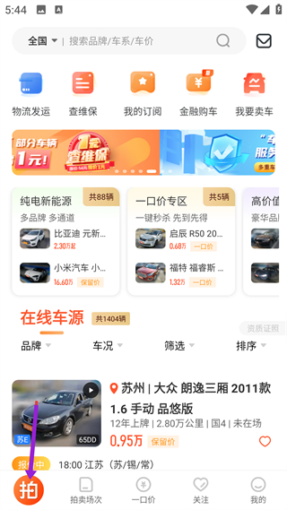 1、首頁,提供物流發運等工具,展示純電新能源等車源分類,在線車源支持篩選,是車源信息的聚合頁面。